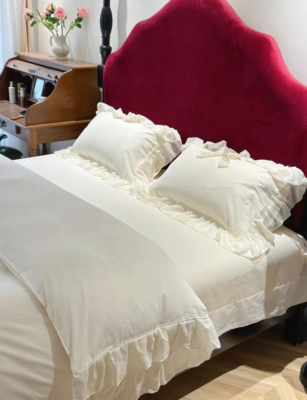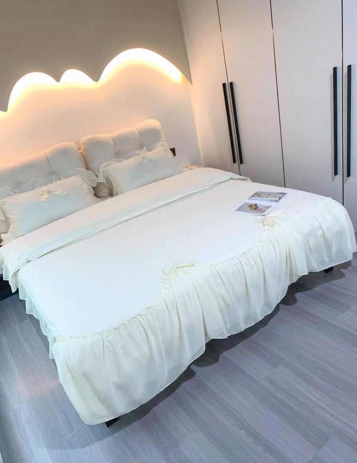 Wide ruffle borders, tiny bows and soft cream fabric create a romantic, floaty look that feels like a boutique hotel suite or drama K-romance scene. It’s elegant, not childish, and instantly makes your bed the prettiest corner of the room.